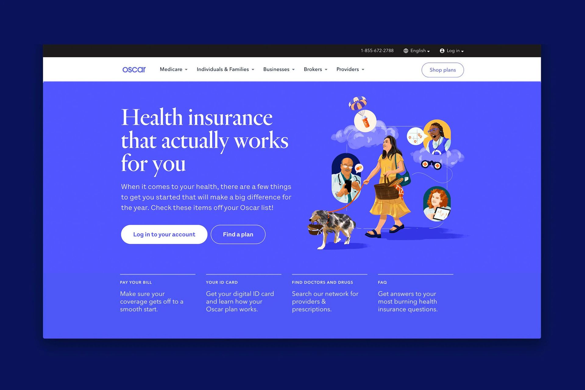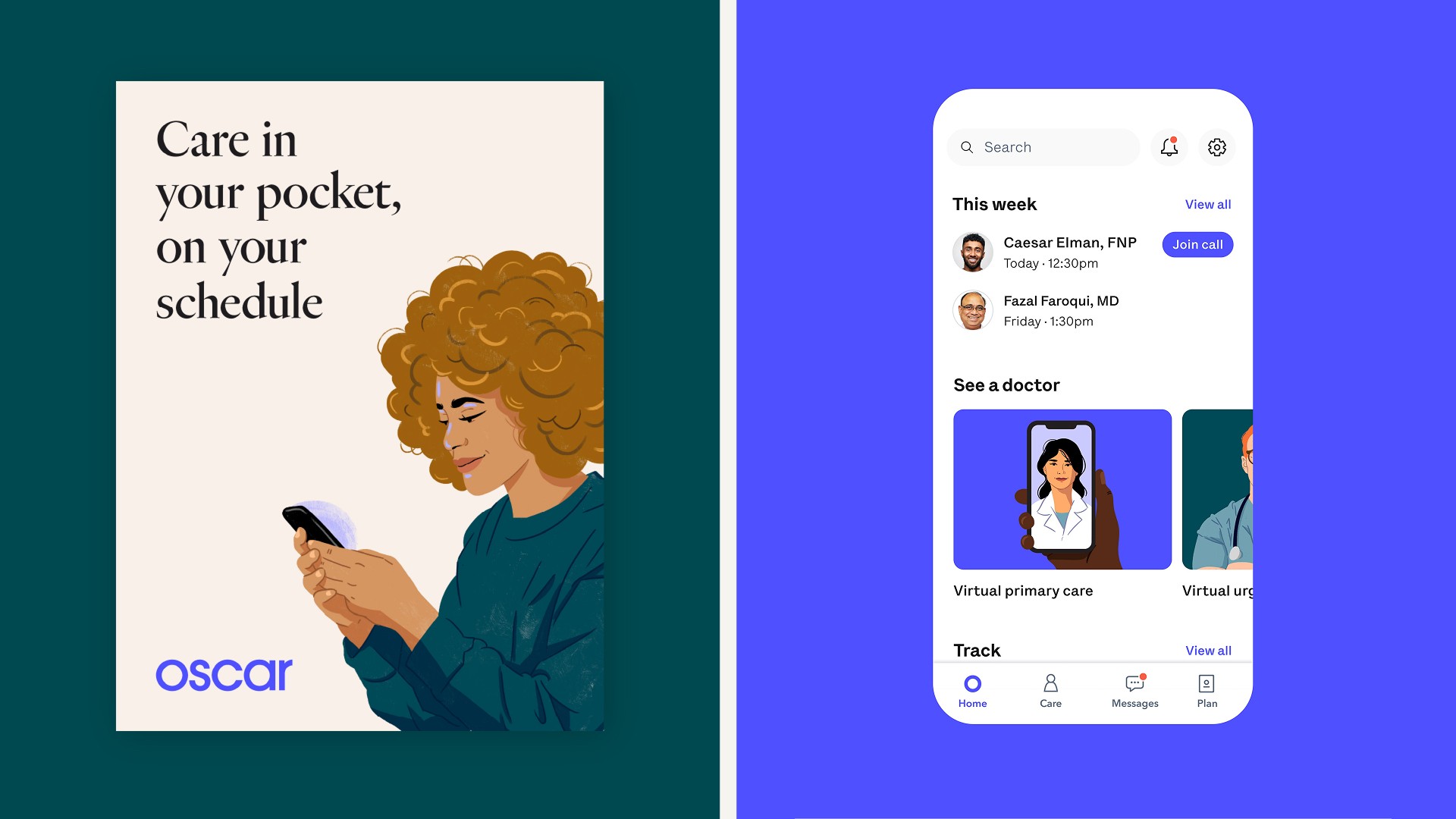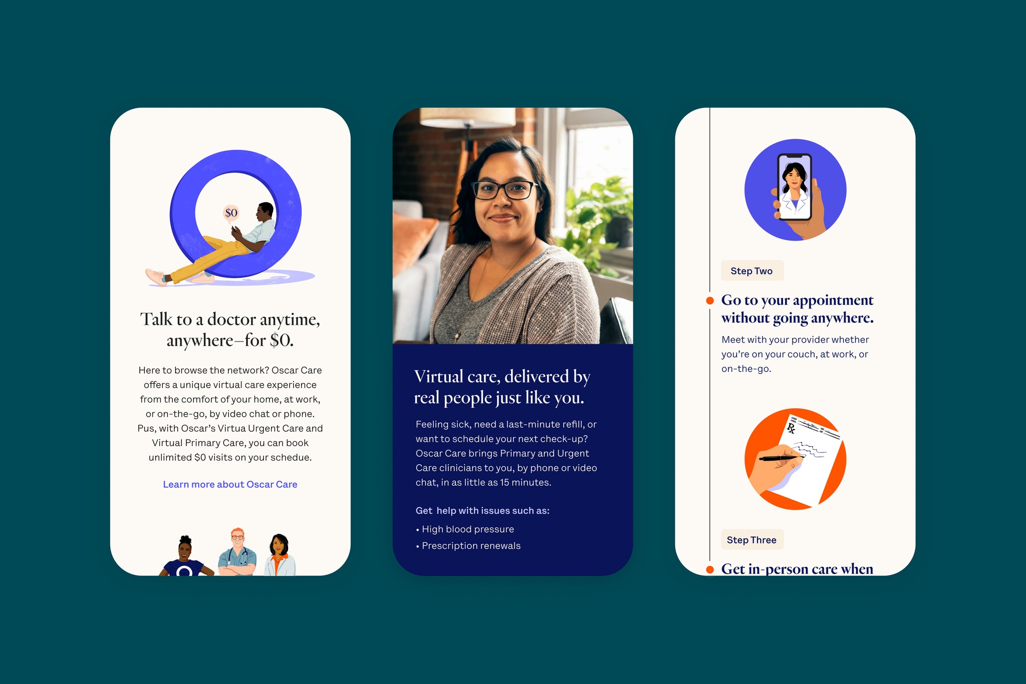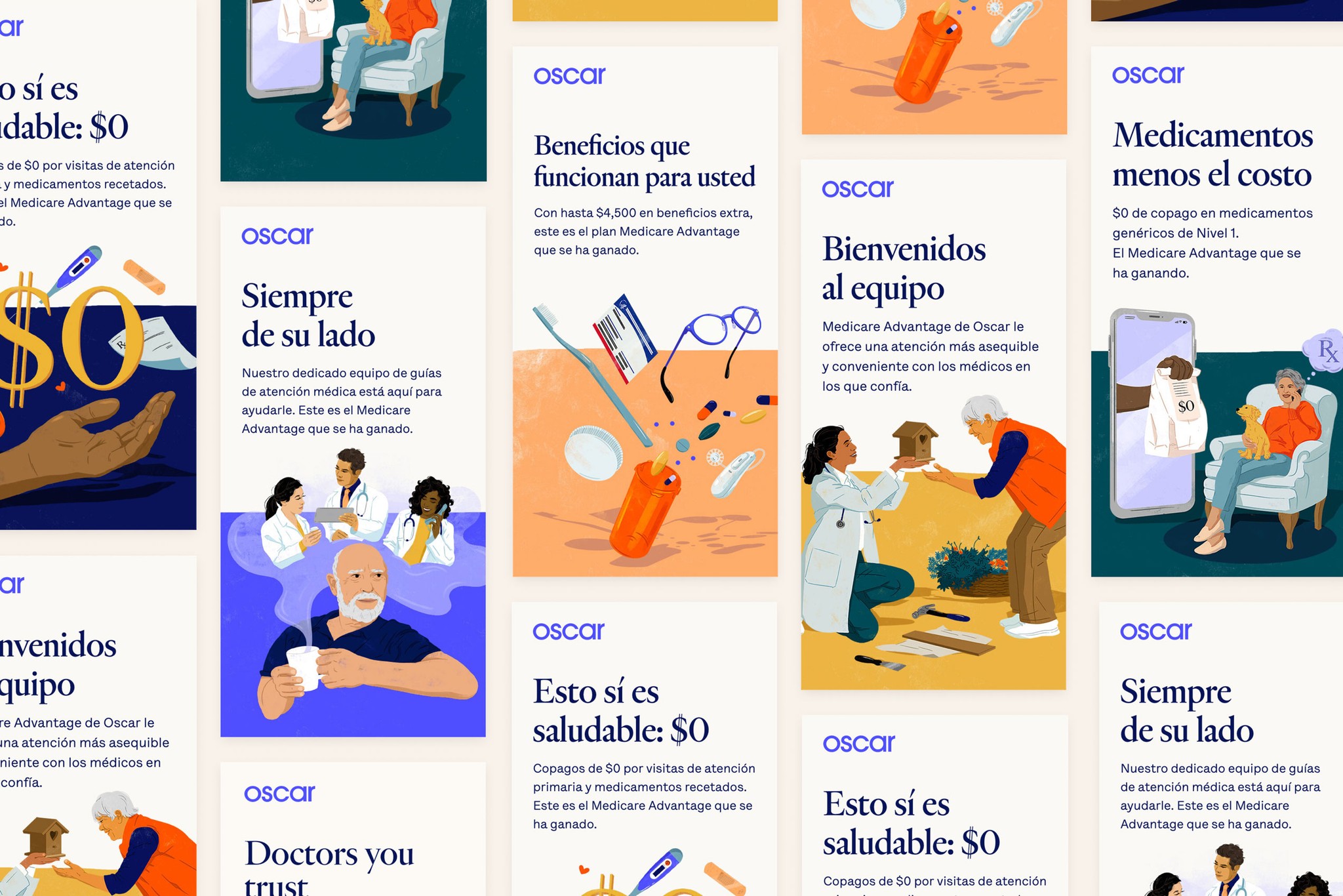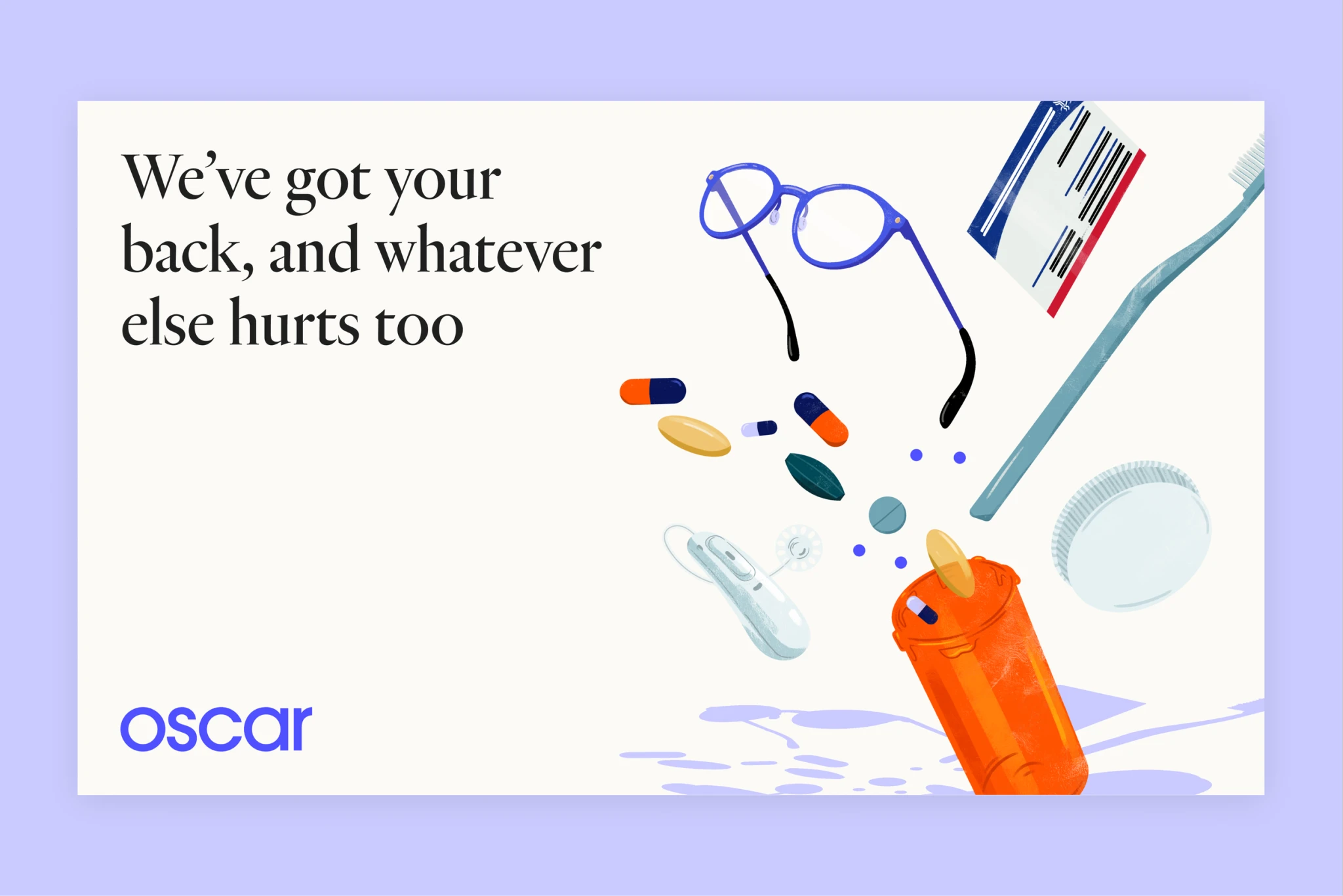 The Oscar brand has always had roots in industry-defining illustration. Research with our older audiences showed that flat and abstract illustrations were unattractive. With Franklyn, we shaped a style that shows real people, doing real things. We hoped a member could feel care and resonance through the craft in our illustrations.